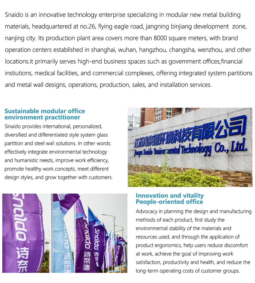 Snaido, an innovative tech enterprise specializing in modular metal building materials, is headquartered in Nanjing with an 8,000㎡ production base and operations in Shanghai, Wuhan, and other cities. Serving premium commercial spaces, it offers integrated partition and metal wall solutions. Inheriti